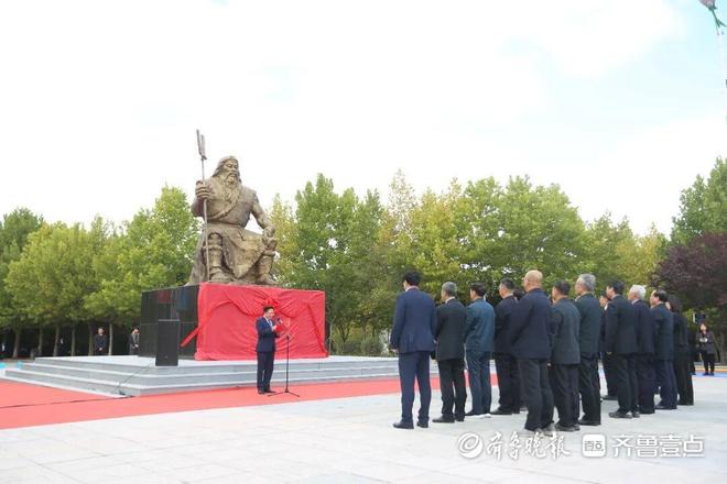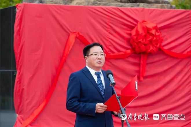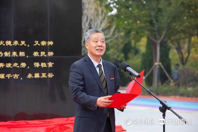 原山东省粮食局党组书记、局长邹大民,山东省粮食和物资储备局党组书记、局长常绪扩,山东商务职业学院党委书记孙云茂,济南校友会会长吕学彬为神农氏雕像揭幕。