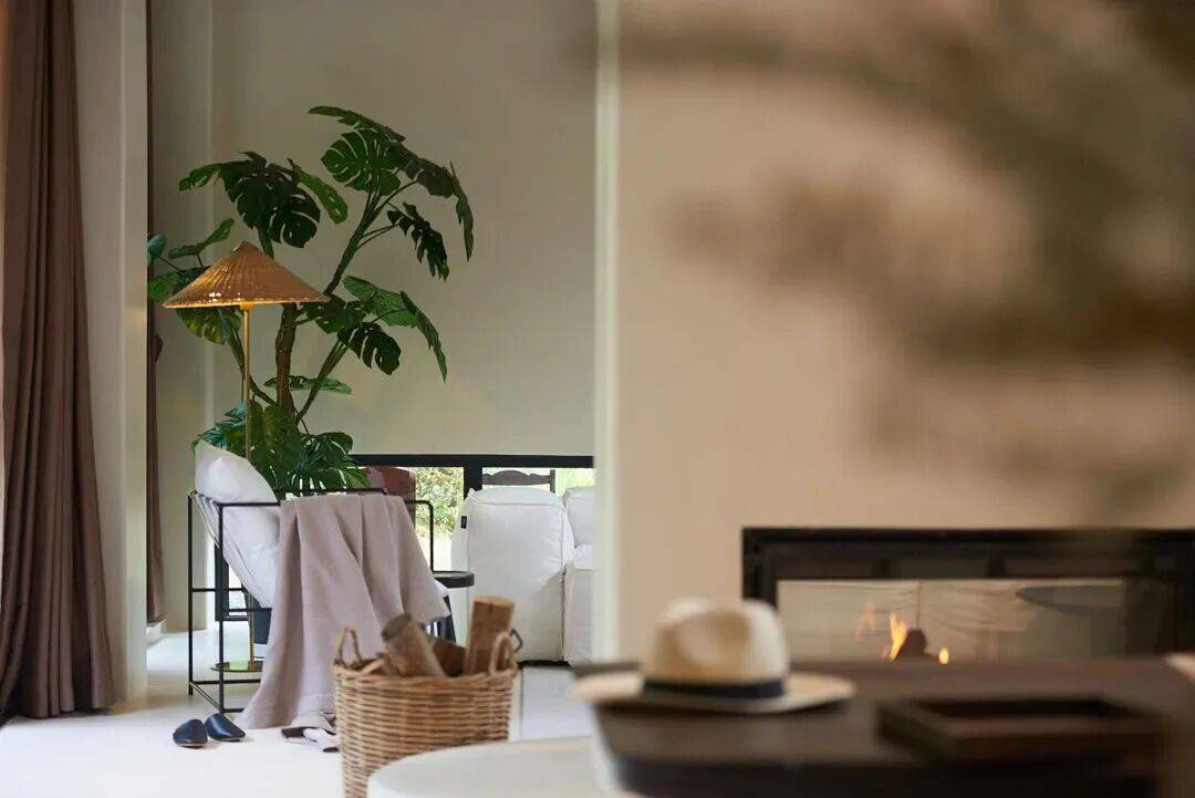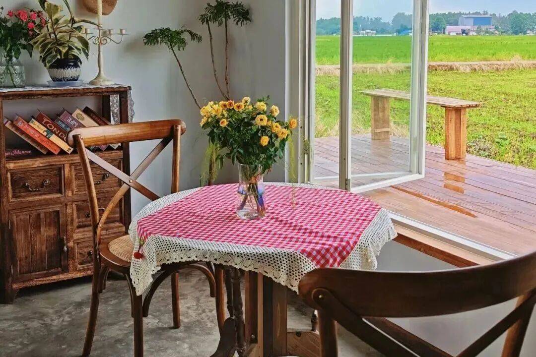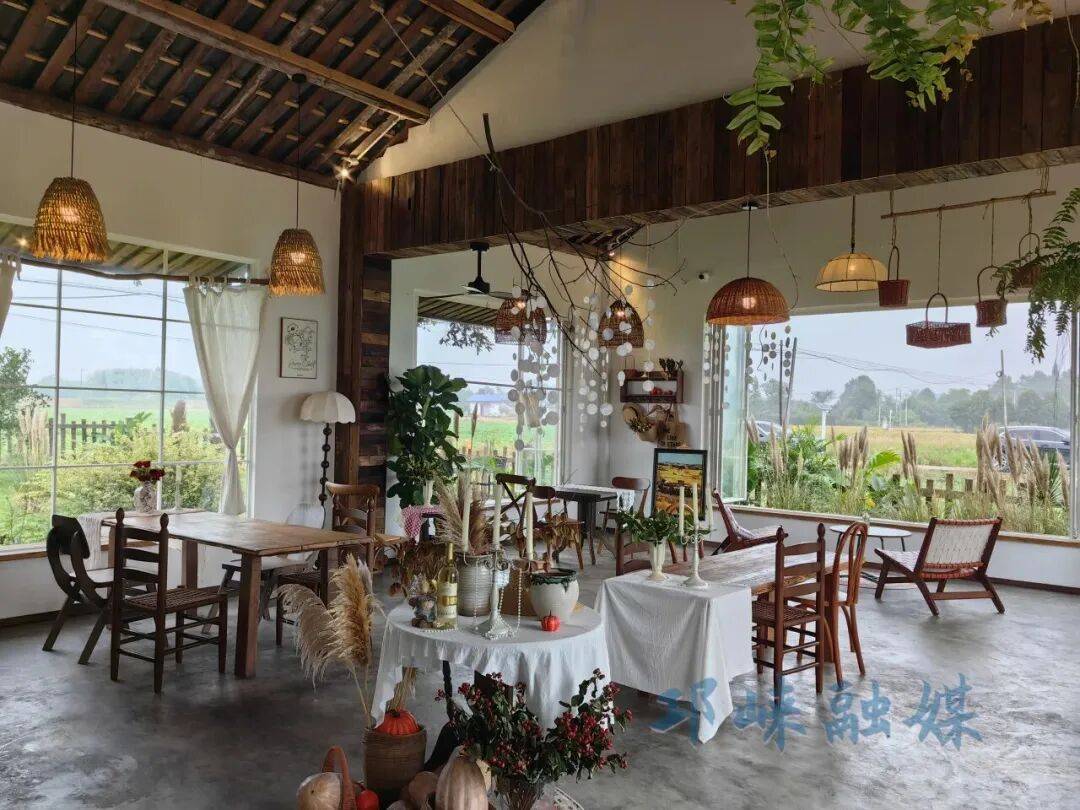 走进“花田”,自然气息扑面而来,木质横梁着原始纹理,藤编吊灯洒下暖黄光线,角落的绿植与干花摆件相映成趣。四面大落地窗将室外田野、远处村落的景致框成一幅幅动态画卷。